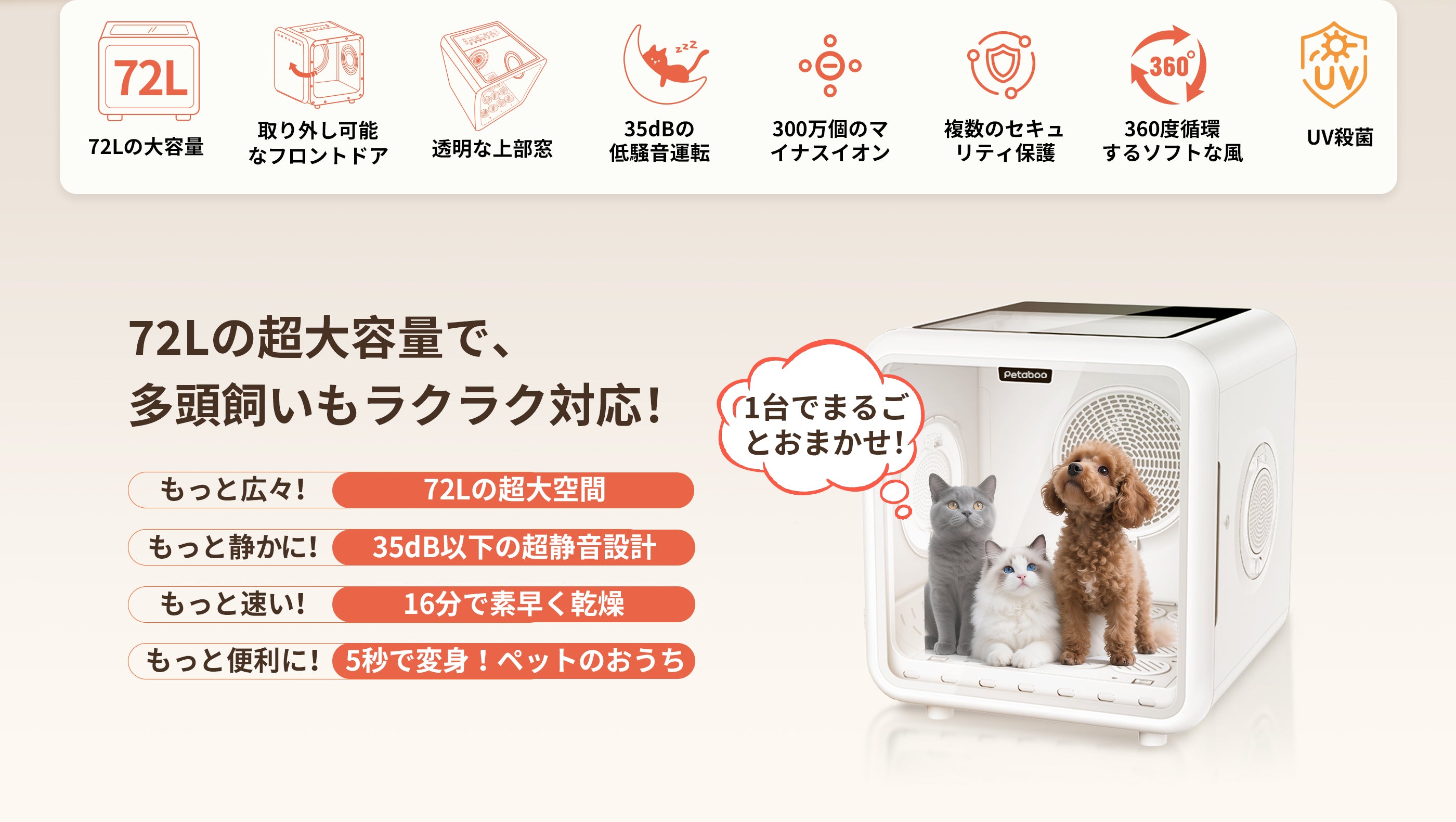 - 72L超大容量で小型~中型犬・猫に対応、広々空間で快適ドライ